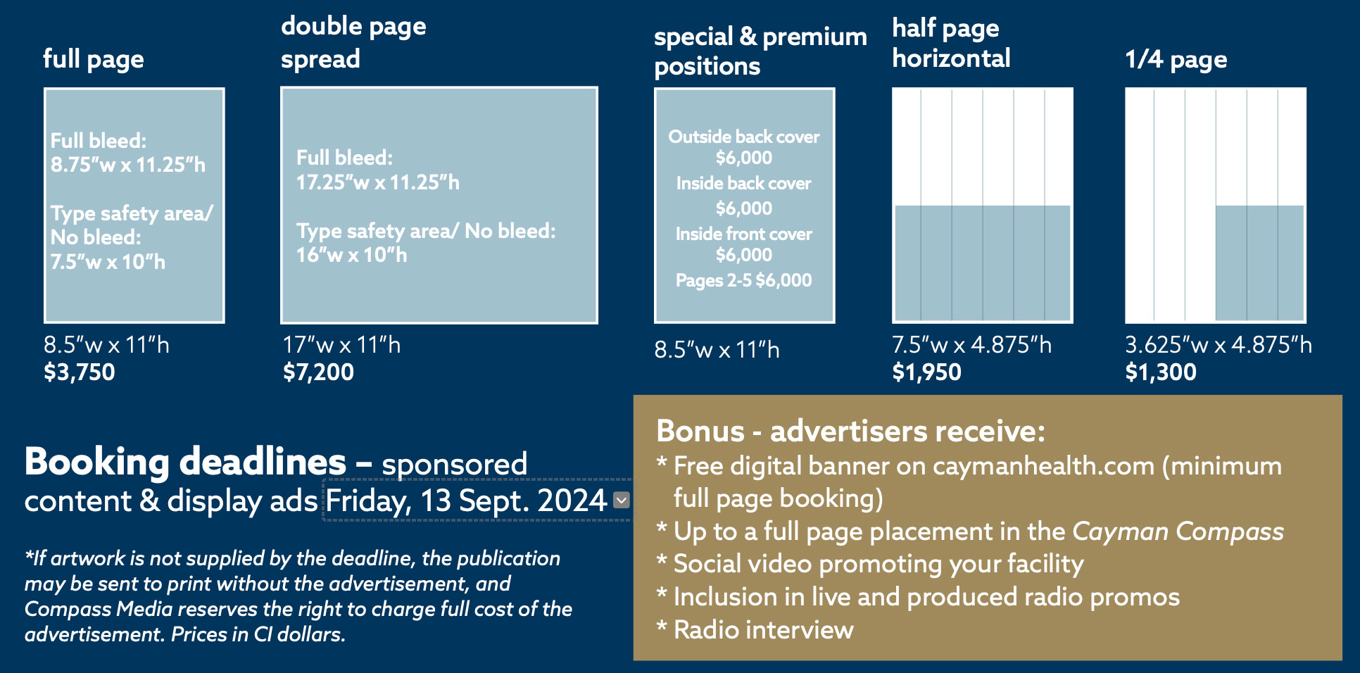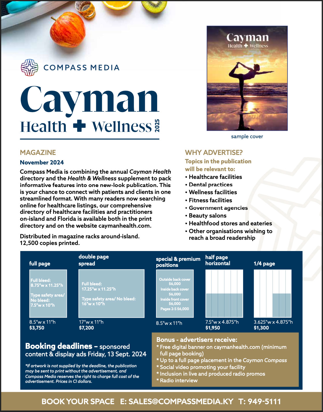 Compass Media is combining the annual Cayman Health directory and the Health & Wellness supplement to pack informative features into one new-look publication. This is your chance to connect with patients and clients in one streamlined format. With many readers now searching online for healthcare listings, our comprehensive directory of healthcare facilities and practitioners on-island and Florida is available both in the print directory and on the website caymanhealth.com.